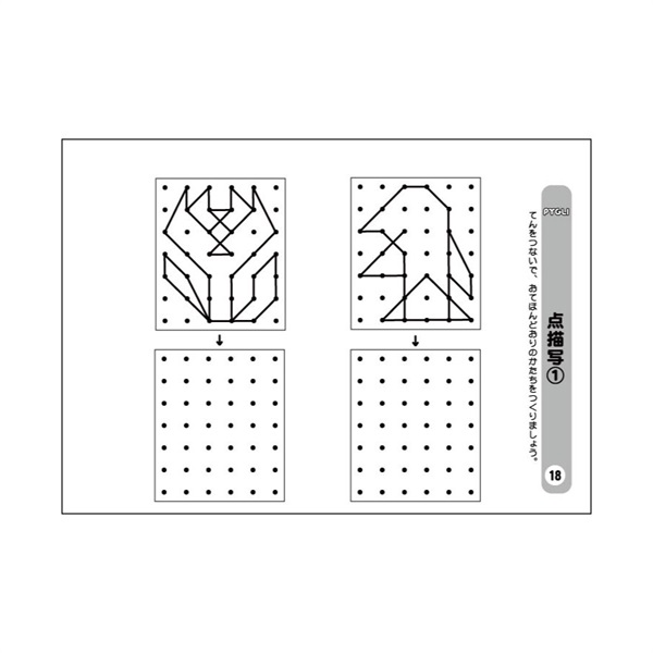 お手本通りに図形を点に沿って書き写します。点描写の問題は、小学校の入試問題でもよく用いられるものの一つです。点描写によって「注意力」「構成把握能力」「作業能力」「筆圧」「指先の調整能力」などの知能因子のチェックを一度に行うことができるので、よく出題されるのだと思われます。特に、図形関連の能力とは、深い関係があるかのように見受けられます。出題形式としては、お手本の図形をそのまま写す問題が基本です。まずは点描写の基本的な問題を取り上げた『点描写①』から始めてください。