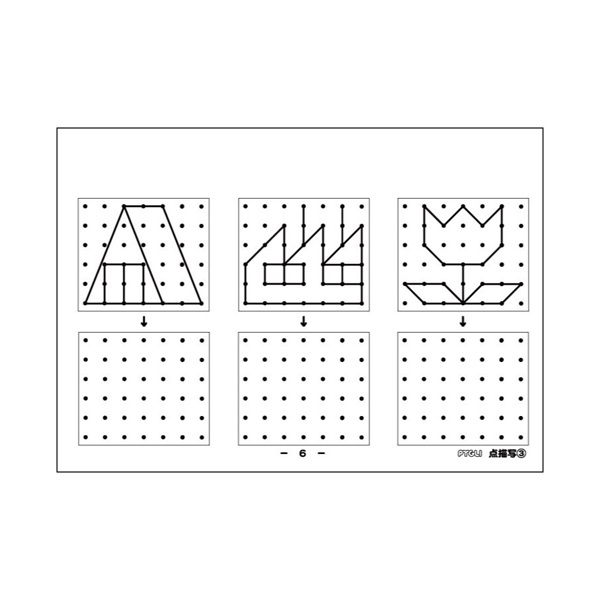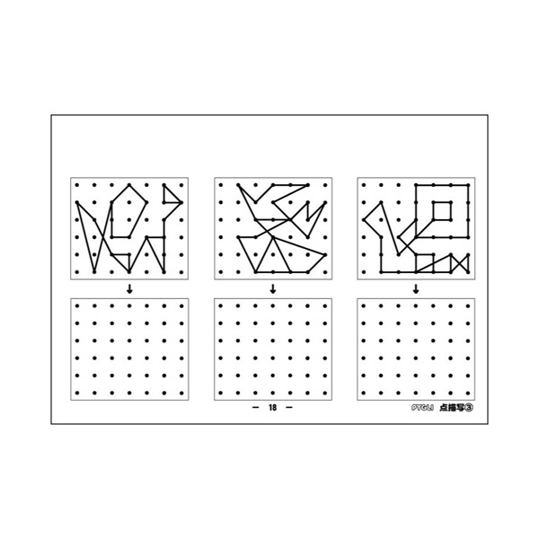 『点描写①,②』とは違い、線の数が増え、とらえにくい斜めの線も多くなりますが、ある程度点描写に慣れた子どもにはぜひチャレンジさせてみてください。このレベルの点描写が難なくできるようになれば、さまざまな能力の向上が目に見えて実感できるようになっているはずです。